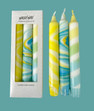 Sunrise Splash is a trio box containing 3 hand Dip Dye spiral twist candle, and two hand marbled candles in blues and yellow hues. Candles display beautifully together in a set or used individually.